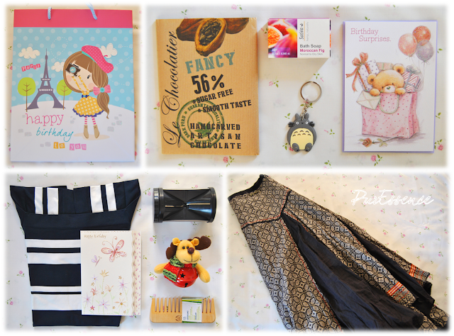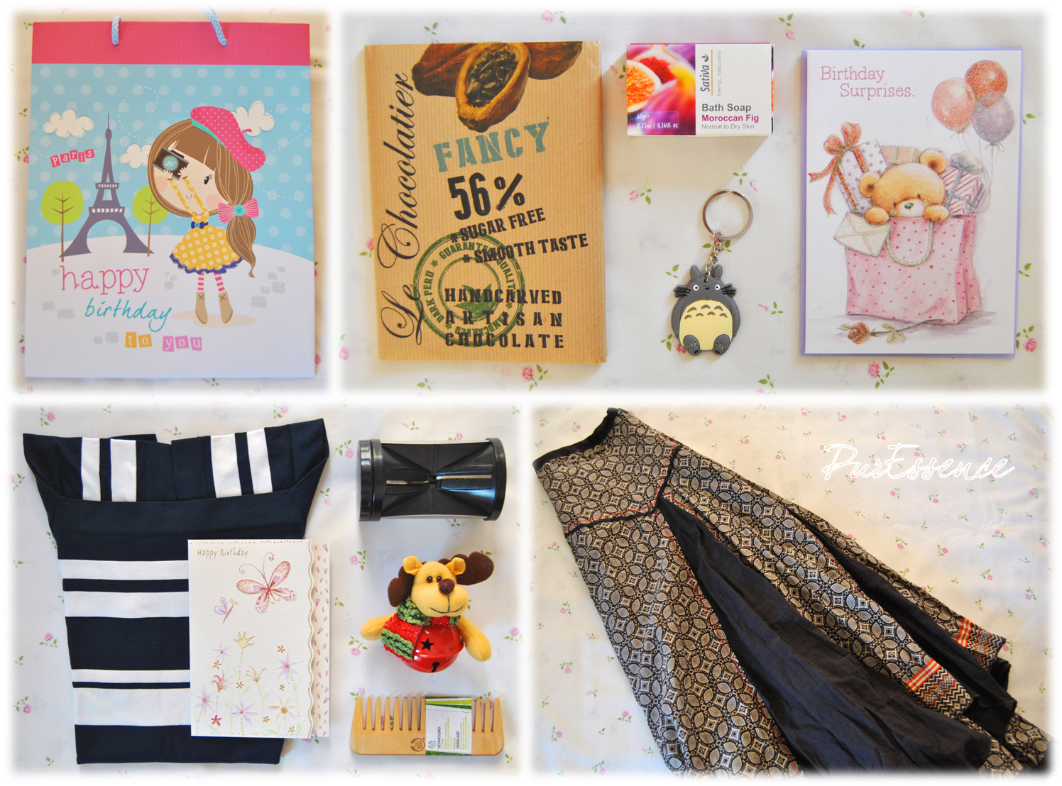 Quanto às prendinhas, estas foram coisas muito simples, tal como eu gosto. Todas elas vinham dentro do saco da primeira foto, que eu achei tão giro que tive de partilhar. Do meu namorado recebi um postal muito fofinho, um sabonete de figo marroquino da Sativa, que cheira maravilhosamente bem, um porta-chaves do Totoro, uma personagem dos filmes do Hayao Miyazaki e um chocolate da minha marca preferida, o Le Chocolatier. Para quem não sabe, eu adoro animação japonesa e sou fã dos filmes do Miyazaki. O Totoro é uma personagem do filme Tonari no Totoro (O Meu Vizinho Totoro), e é das criaturas mais fofas que eu já vi. A mãe do meu namorado ofereceu-me um postal também muito lindo, uma blusa do Truworths, num padrão marinheiro e com um decote quadrado, que é dos meus decotes favoritos, um pente da The Body Shop, porque o meu se partiu, um guizo de Natal em forma de rena, sim já foi fora de época, mas eu adoro guizos e quando o vi na loja fiquei apaixonada por ele. O mini spiralizer foi uma prenda do meu namorado, da mãe e da avó e sempre foi algo que eu quis, para fazer noodles de vegetais. A saia do Truworths foi uma prenda de mim para mim.
